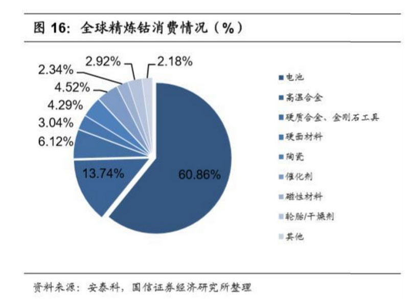 鈷的物理、化學(xué)性質(zhì)決定了它是生產(chǎn)耐熱合金、硬質(zhì)合金、防腐合金、磁性合 金以及各種鈷鹽的重要材料、下游被廣泛應(yīng)用于電池、制取合金、制取顏料、 醫(yī)療等領(lǐng)域。根據(jù)安泰科統(tǒng)計,2018 年全球精煉鈷總體需求量約為 12.6 萬噸, 同比增長接近11.5%,其中電池行業(yè)用鈷量約為7.8萬金屬噸,占比約為60.86%, 高溫合金用鈷量約為 1.76 萬金屬噸,占比約為 13.74%,其他行業(yè)用鈷量較為 平均;而中國鈷消費量約為 6.47 萬噸,同比增速達(dá)到 19.81%。2019 年以來受 全球經(jīng)濟不確定性影響以及中美貿(mào)易戰(zhàn)為代表的國家間的貿(mào)易保護對消費起到 一定的抑制作用,鈷下游領(lǐng)域 3C 市場處于低迷期,航空業(yè)以及硬質(zhì)合金等行 業(yè)均受到波及,新能源汽車領(lǐng)域一枝獨秀但基數(shù)較小。