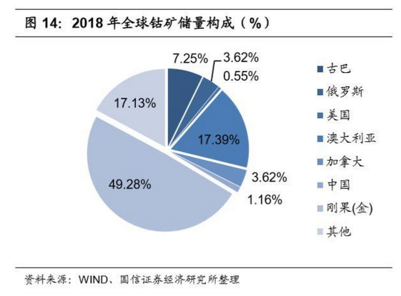 全球鈷礦資源接近 50%來源于剛果(金)。根據(jù)美國地質(zhì)勘探局統(tǒng)計,2018 年 全球鈷礦儲量為 690 萬公噸,其中接近 50%左右來源于剛果金,澳大利亞、古 巴、俄羅斯、加拿大、中國、美國、贊比亞等也均有分布。而從產(chǎn)量角度來看, 2018年全球鈷礦產(chǎn)量為14萬公噸,其中剛果(金)為9萬公噸,占比達(dá)到64.29%, 是絕對的鈷資源大國。