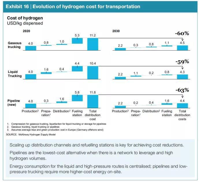 對(duì)于典型的300至500公里的距離,氣態(tài)和液態(tài)氫運(yùn)輸?shù)某杀緫?yīng)降低每公斤0.10美元至0.20美元,這是由于利用率提高以及隨著規(guī)模擴(kuò)大、設(shè)備成本降低。