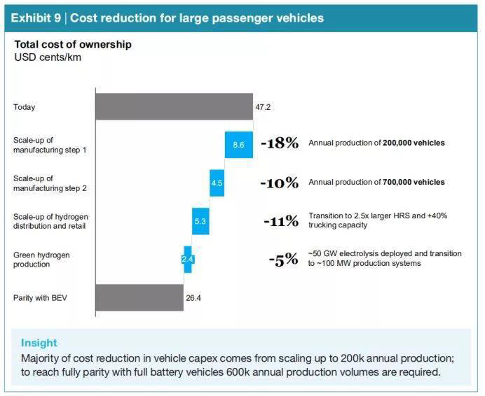 到2030年,大型乘用車(chē)的TCO可能下降約45%,這主要受三個(gè)主要因素的影響:低成本的汽車(chē)資本支出,低成本的氫氣分銷(xiāo)和零售以及低成本的氫氣生產(chǎn)。這些成本降低對(duì)于實(shí)現(xiàn)與BEV的成本均等至關(guān)重要。