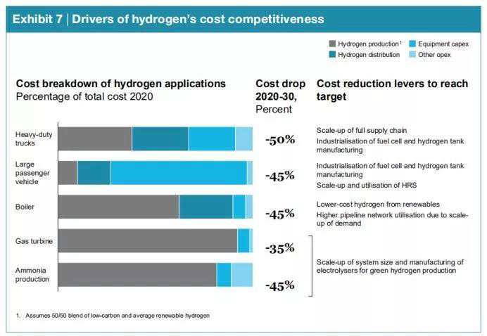報(bào)告指出,氫能解決方案的成本將在未來(lái)10年急劇下降,遠(yuǎn)遠(yuǎn)超出此前預(yù)期。隨著氫氣生產(chǎn)、分銷(xiāo)、裝備和零部件制造規(guī)模不斷擴(kuò)大,預(yù)計(jì)到2030年氫能產(chǎn)業(yè)鏈整體成本將下降50%。