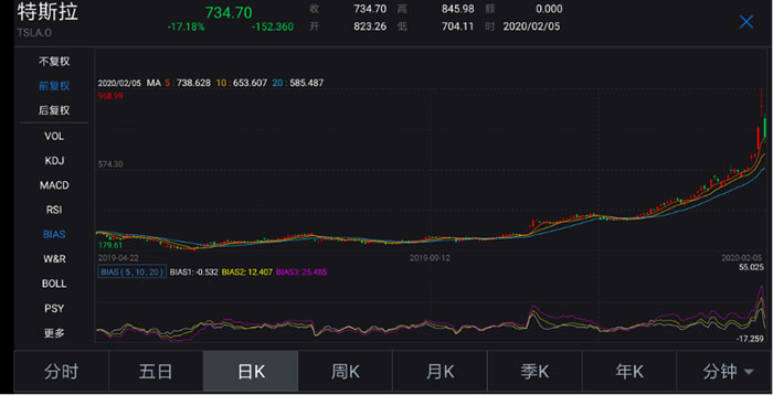 近日資本市場(chǎng)上的表現(xiàn),讓“特斯拉”與“瘋狂”兩個(gè)詞語常常同時(shí)出現(xiàn)。繼上一個(gè)交易日特斯拉日K線幾近收成銳利的“十字”,盤中股價(jià)一度逼近千美元之后,《中國(guó)經(jīng)營(yíng)報(bào)》記者注意到,美東時(shí)間2月5日,特斯拉未能延續(xù)“瘋狂”,股價(jià)低開后跌至734.70美元/股,跌幅17.18%。