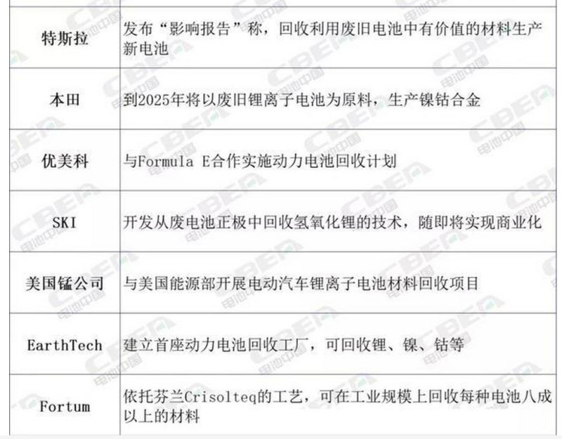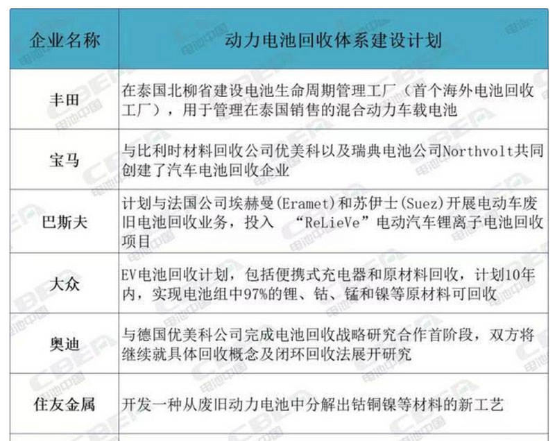 與中國(guó)動(dòng)力電池回收市場(chǎng)一樣,隨著全球新能源電動(dòng)汽車(chē)體量的不斷擴(kuò)大,全球動(dòng)力電池回收市場(chǎng)也在進(jìn)一步擴(kuò)容。與此同時(shí),國(guó)外一些主流主機(jī)廠、電池廠、材料企業(yè)及回收機(jī)構(gòu)也公布了詳細(xì)的動(dòng)力電池回收體系建設(shè)計(jì)劃。