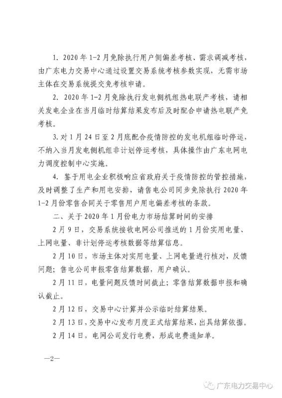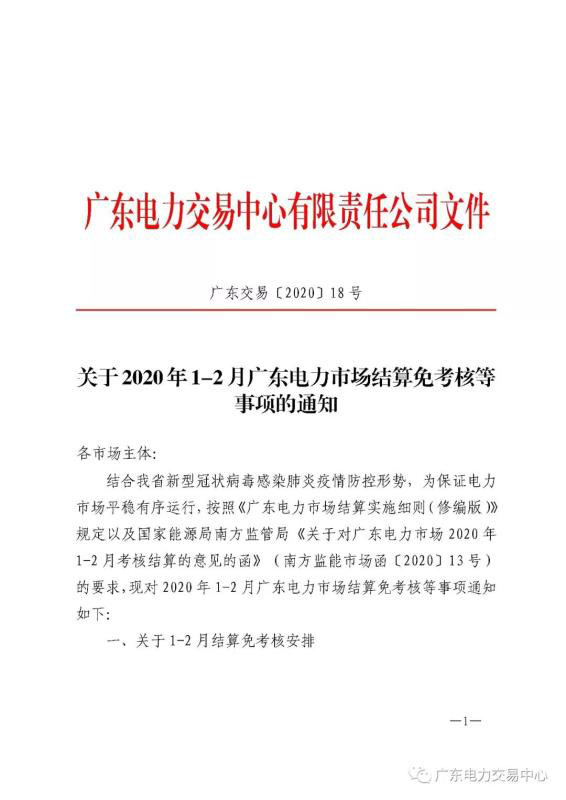 結(jié)合我省新型冠狀病毒感染肺炎疫情防控形勢(shì),為保證電力市場(chǎng)平穩(wěn)有序運(yùn)行,現(xiàn)對(duì)2020年1-2月廣東電力市場(chǎng)結(jié)算免考核等事項(xiàng)通知如下: