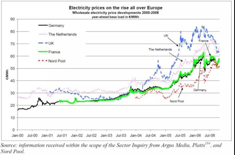 如圖2所示,2003年夏季開始,歐盟批發(fā)電價出現(xiàn)明顯上漲,同時各成員國電價差異也越來越大,這與歐洲統(tǒng)一電力市場目標(biāo)相悖。歐盟委員會也接到市場成員投訴,反映市場進(jìn)入比較困難,同時電力用戶的選擇權(quán)也受到限制。因此,歐盟委員會于2005年6月決定依據(jù)Regulation 1/2003的第17條(Art. 17)針對燃?xì)夂碗娏π袠I(yè)展開能源行業(yè)調(diào)查(Energy Sector Inquiry),目的在于評估行業(yè)競爭狀況,尋找能源市場運(yùn)行不正常的原因。經(jīng)過一年半的調(diào)查與意見征求,歐盟委員會發(fā)布了350頁的調(diào)查報告,列舉出能源行業(yè)存在以下五個方面的問題[1]: