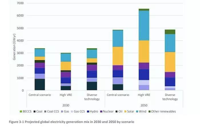 研究模擬了集中式、高比例可再生能源滲透和多樣化技術(shù)三種情景進(jìn)行分析,而幾乎在所有的場(chǎng)景中,CSIRO的研究均預(yù)計(jì)到2050年全球能源格局將由風(fēng)能和太陽(yáng)能主導(dǎo)。核能可能會(huì)在“多樣化技術(shù)”的場(chǎng)景中扮演一個(gè)稍微重要的角色,但這只是人為限制了風(fēng)能和太陽(yáng)能的使用。