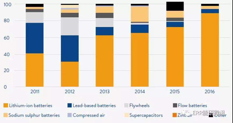 2011~2016年儲能規(guī)模結(jié)構(gòu),按技術(shù)劃分(不含抽水蓄能)