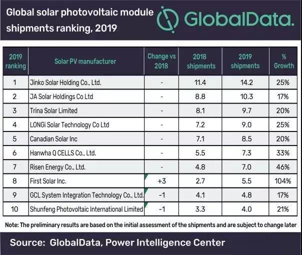 名單上唯一的美國制造商是FirstSolar,是迄今為止該榜單上所有公司中增幅最大的公司,2019年的發(fā)貨量增長了104%,從2018年的第十一躍升至2019年的第八,出貨量為5.5GW。