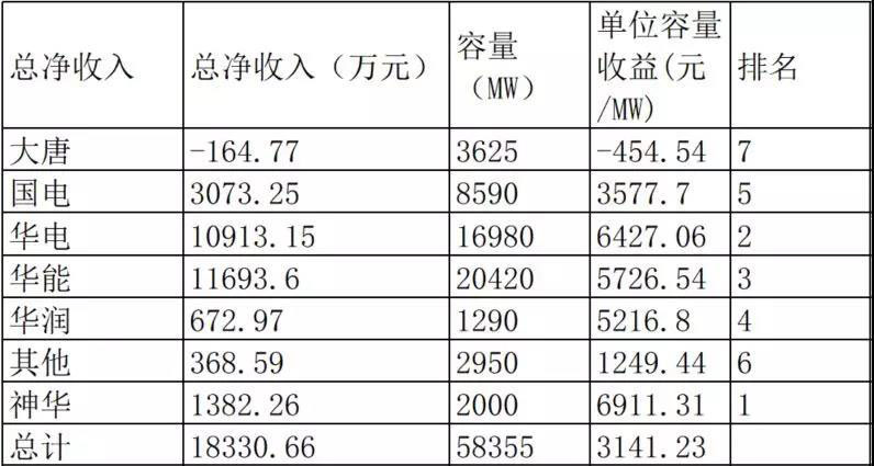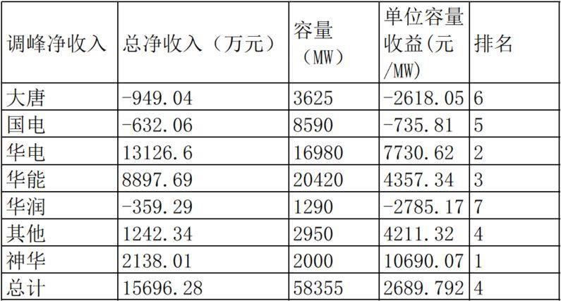 看調(diào)峰凈收入排名情況,第一名是神華集團(tuán),最后一名成了華潤(rùn)集團(tuán)。從對(duì)比上看,押注于調(diào)峰市場(chǎng)的神華集團(tuán),是成績(jī)最好的選手。