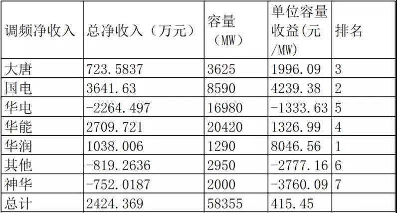 再看調(diào)頻凈收入排名情況,第一名是華潤(rùn)集團(tuán),最后一名成了神華集團(tuán)。而在總凈收入里最后一名大唐集團(tuán)的收益排名,升到了第三名。