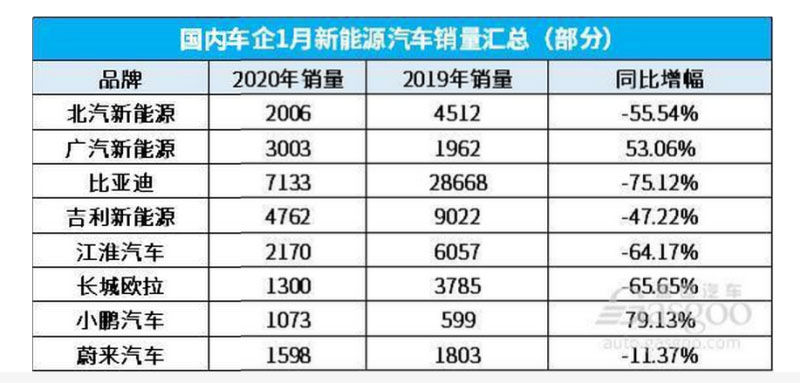 根據(jù)中國(guó)汽車工業(yè)協(xié)會(huì)發(fā)布的最新產(chǎn)銷數(shù)據(jù)顯示,國(guó)內(nèi)新能源汽車的產(chǎn)銷在1月受到疫情和春節(jié)假期的影響,出現(xiàn)了較大幅度的下滑,產(chǎn)銷預(yù)計(jì)分別完成4.0萬(wàn)輛和4.4萬(wàn)輛,同比分別下滑55.4%和54.4%,與此同時(shí),各家車企也在近日陸續(xù)公布了1月新能源汽車銷量數(shù)據(jù)。