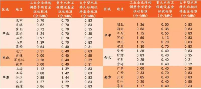 其他幾項(xiàng)電價(jià)中的附加基金如下表所示。