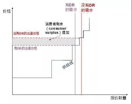 為了激勵(lì)DR參與市場,補(bǔ)償費(fèi)用并非基于邊際定價(jià),而是基于消費(fèi)者剩余增加(consumer surplus) 的三分之一來計(jì)算。市場出清機(jī)制運(yùn)行兩次,一次是有DR參與的,另一次是沒有DR參與的,具體情況如圖5所示。DR的提供能降低了批發(fā)電力市場出清價(jià)格,從而增加消費(fèi)者剩余;DR提供者的補(bǔ)償費(fèi)用是消費(fèi)者剩余增加的三分之一,最高可達(dá)4500新加坡幣/兆瓦時(shí)(折合人民幣23元/千瓦時(shí))。