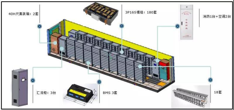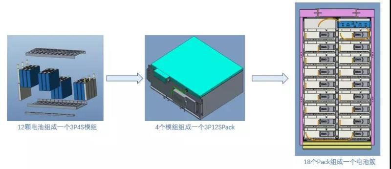 該系統(tǒng)與前兩種相比,最顯著的差別是省去了變壓器,無(wú)需再升壓,系統(tǒng)效率更高,相同出力下,電流更低,電池壽命更長(zhǎng)。更多關(guān)于級(jí)聯(lián)系統(tǒng)的特點(diǎn),請(qǐng)找我的好朋友付金建,保證他會(huì)滔滔不絕,我只介紹力信電池系統(tǒng)的設(shè)計(jì)。以智光5MW/3MWh方案為例,分為3相,每相配置為1.7MW/1MWh,設(shè)備集成在一個(gè)40尺集裝箱內(nèi)。其中的電池簇由18個(gè)PACK組成,總電壓691.2V,總?cè)萘?3kWh;每個(gè)PACK由36顆40Ah電芯以3P12S方式成組,每簇電壓38.4V,結(jié)構(gòu)如下圖。