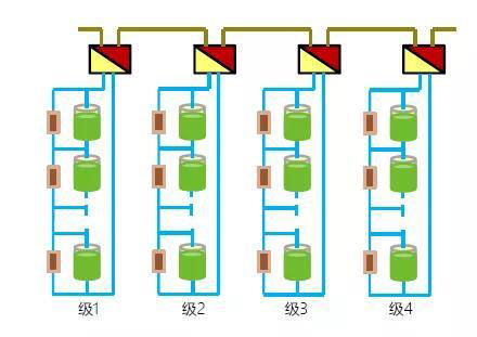 解決了電池簇間環(huán)流問(wèn)題,還有人不滿(mǎn)足,那就是智光電氣,他們借助在高壓側(cè)的多年經(jīng)驗(yàn),在分散集中式系統(tǒng)上再做變革升級(jí),將PCS小機(jī)的交流側(cè)由并聯(lián)改為串聯(lián),拓?fù)浣Y(jié)構(gòu)如下圖: