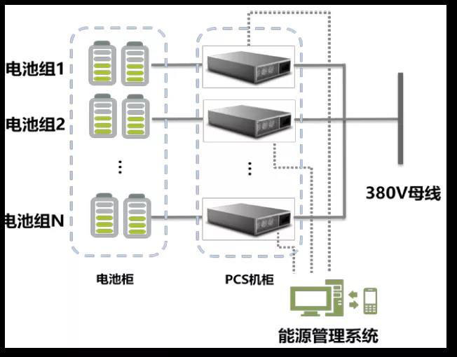 以上方案的不足之處是并聯(lián)電池柜之間存在環(huán)路電流,電池均衡存在木桶效應(yīng),不利于電池的精細(xì)化管理,交流側(cè)PCS并聯(lián)升壓,整個(gè)系統(tǒng)損耗較大,轉(zhuǎn)化效率偏低。