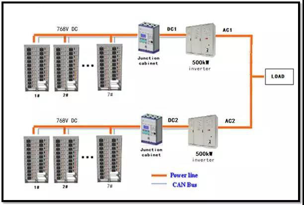 常規(guī)系統(tǒng)是使用最多,技術(shù)最成熟的方案,其特點(diǎn)是通過(guò)直流電池端的并聯(lián)匯流,實(shí)現(xiàn)儲(chǔ)能單元容量的提升,比如力信標(biāo)準(zhǔn)電池簇容量122kWh,7臺(tái)電柜出線(xiàn)端并聯(lián),匯流后接入500kW儲(chǔ)能逆變器(PCS柜),組成800kWh儲(chǔ)能單元,PCS之間并聯(lián)接入變壓器,對(duì)外供電。