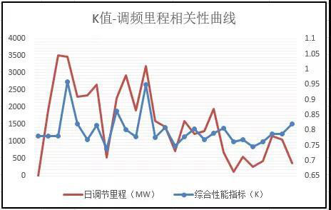 以上性能指標(biāo)除了表征調(diào)頻單元參與AGC響應(yīng)效果之外,更重要的是性能指標(biāo)的高低直接影響機(jī)組調(diào)頻收益。調(diào)度機(jī)構(gòu)將單位報(bào)價(jià)V與K值的比值(V/K)作為競(jìng)價(jià)排名的指標(biāo)P,依次從低到高排序,排名靠前者中標(biāo),比如A機(jī)組報(bào)價(jià)10元/MW,K值0.8,B機(jī)組報(bào)價(jià)13元/MW,K值1.5,則調(diào)頻性能指標(biāo)PA=12.5,PB=8.66,于是價(jià)格高B機(jī)組反而優(yōu)先中標(biāo)。這種綜合指標(biāo)評(píng)定法做到了K值越高,收益越好,也實(shí)現(xiàn)為效果付費(fèi)的承諾。另外,針對(duì)K值高的機(jī)組,調(diào)度中心還能增加調(diào)頻里程(單位MW),機(jī)組收益進(jìn)一步擴(kuò)大,如下圖為K值與調(diào)頻里程的相關(guān)性曲線(xiàn)。