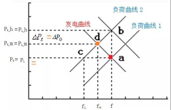 假如發(fā)電側(cè)不動(dòng)作,即PG不變(PG<PL_h),此刻頻率果斷下降,系統(tǒng)狀態(tài)點(diǎn)將沿著負(fù)荷曲線(xiàn)2由b下降到c(fL,PG_h,PL_h)。但是發(fā)電機(jī)組有自動(dòng)調(diào)節(jié)功能,在發(fā)電機(jī)組調(diào)速器的作用下,將因頻率的下降而增加出力,機(jī)組狀態(tài)將由a點(diǎn)出發(fā),沿著發(fā)電曲線(xiàn)一路抬升,與負(fù)荷曲線(xiàn)2形成十字交叉點(diǎn)d,達(dá)到新的平衡點(diǎn)。此刻的狀態(tài)坐標(biāo)為d(fm,PG_m,PL_m) 。以上調(diào)節(jié)過(guò)程為機(jī)組自發(fā)過(guò)程,也就是一次調(diào)頻。
