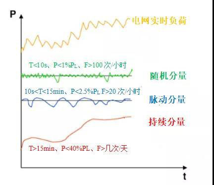 電力系統(tǒng)中頻率調(diào)節(jié)的主要方式是根據(jù)區(qū)域內(nèi)用電負(fù)荷的變化來(lái)調(diào)配相應(yīng)的發(fā)電機(jī)組,提供對(duì)等的發(fā)電量。然而電力系統(tǒng)的負(fù)荷無(wú)時(shí)無(wú)刻都在發(fā)生不規(guī)則的變動(dòng),我們每一個(gè)人對(duì)用電設(shè)備的操作都會(huì)對(duì)區(qū)域負(fù)荷造成影響。分析負(fù)荷變動(dòng)的特性,可將其變動(dòng)規(guī)律分解為三種不同變化的分量(如下圖):