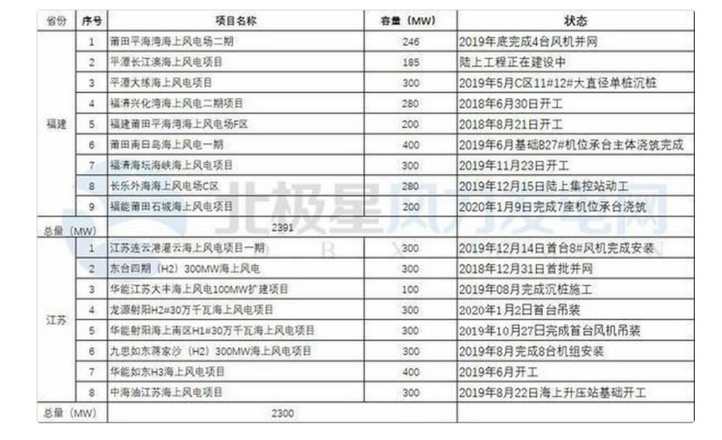 2019年福建、江蘇在建海上風(fēng)電項目表