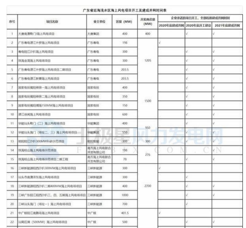 近日,廣東省發(fā)改委發(fā)布“廣東省近海淺水區(qū)海上風(fēng)電項目開工及建成并網(wǎng)時間表”,該表格涉及26個海上風(fēng)電項目。其中2020年底將建成并網(wǎng)3個,2021年底建成并網(wǎng)19個。