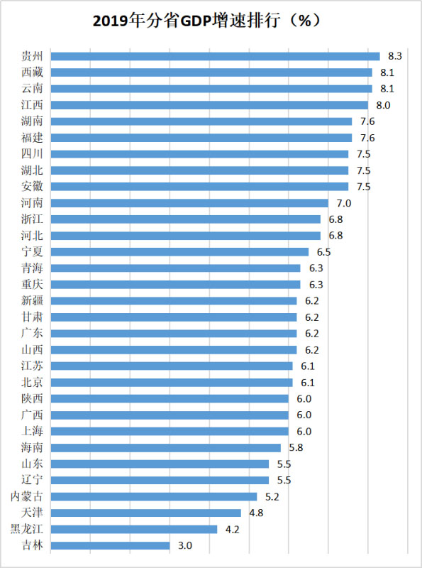 2019年全國分省GDP總量及其增速如上兩圖所示:從GDP總量看,廣東(107671.07億元)最高,西藏(1697.82億元)墊底;從GDP增速看,貴州最快,為8.3%,吉林墊底,增速僅3.0%。