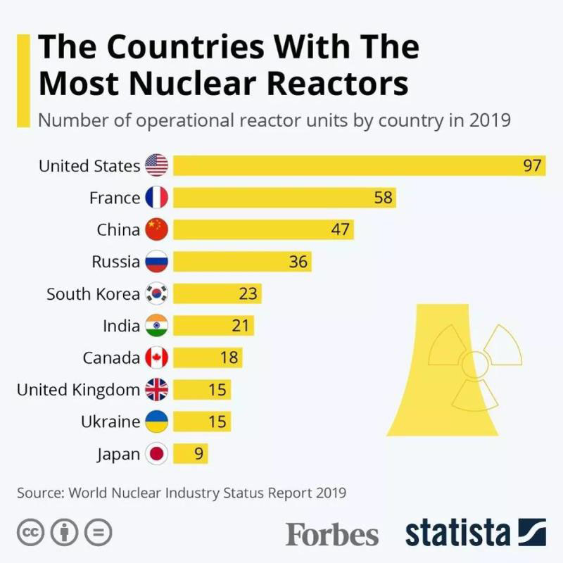 雖然中國近年來把重點(diǎn)放在了可再生能源上,但中國在核電站建設(shè)方面取得了快速進(jìn)展。在2019年,中國的核反應(yīng)堆總數(shù)達(dá)到47座,位居世界第三。俄羅斯和韓國分別以36座和23座位列第四和第五。另外,烏克蘭有15座反應(yīng)堆在運(yùn)行,而日本有9座。不過,值得注意的是,日本是長期停運(yùn)反應(yīng)堆數(shù)量最多的國家,有24座已經(jīng)停運(yùn)。