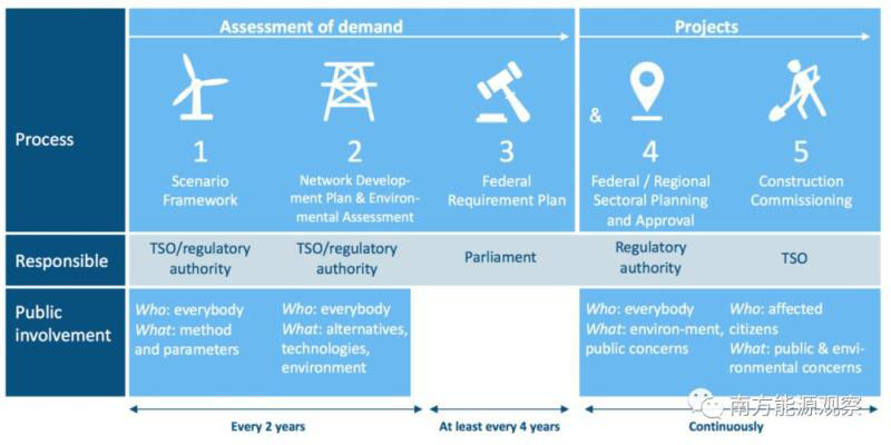 在第四階段,TSOs提交文件,聯(lián)邦或州政府進(jìn)行規(guī)劃,劃定輸電線沿線的大致走廊,通常需要一到兩年,接著分到各區(qū)域來確定輸電線路的具體位置,TSOs才可以開工修建。在此期間,利益相關(guān)方還將提出其公共利益及環(huán)境訴求。