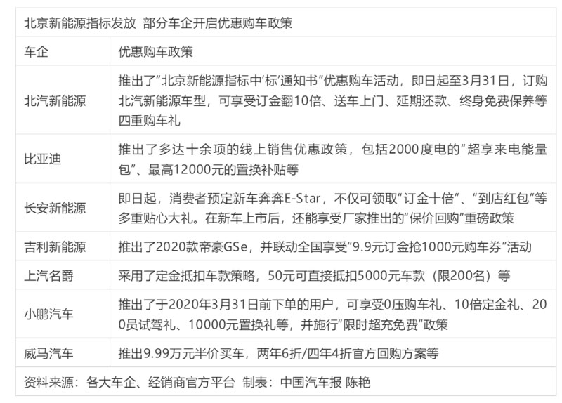 就在北京新能源汽車指標(biāo)發(fā)放前夕,《中國汽車報》記者整理發(fā)現(xiàn),針對獲得2020年北京新能源購車指標(biāo)的消費(fèi)者,北汽新能源、上汽名爵、小鵬汽車等車企在定金方面加大優(yōu)惠力度,比亞迪、吉利新能源、威馬汽車、長安新能源等車企則在購車禮包上下功夫,推出了專屬北京市場的購車優(yōu)惠政策。