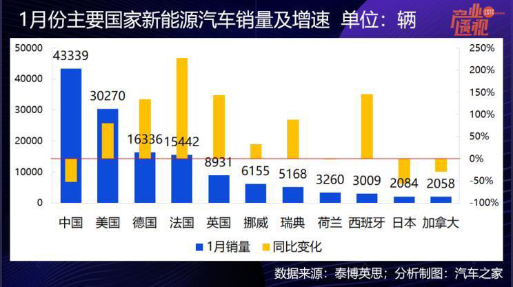 2、歐美市場開年紛紛提速,德國和法國的銷量同比漲幅分別高達134%和228%;