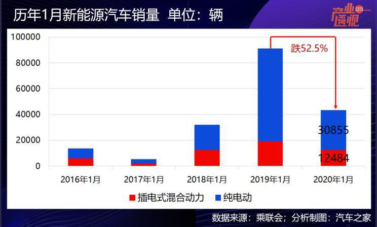 乘聯(lián)會數(shù)據(jù)顯示,2020年1月國內(nèi)新能源乘用車批發(fā)銷售43339輛,同比大降52.5%,其中純電動車批發(fā)30855輛,同比降57.3%,插電式混合動力車批發(fā)12484輛,同比降34.4%。1月份新能源乘用車批發(fā)銷售滲透率也跌到了2.69%。
