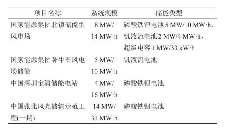 相比于其他領(lǐng)域,儲能在新能源并網(wǎng)應用中需要滿足一些特殊要求:由于新能源電站所處地理位置較為偏遠,儲能系統(tǒng)需滿足配置靈活、安裝方便、使用壽命長等特點,以減少建設周期,并盡可能做到減少維護或免維護;另外新能源電站環(huán)保要求較高,儲能電池、裝置在選擇時應盡量具備綠色無污染等特點。儲能系統(tǒng)的放電以低倍率0.5 C、1 C為主,PCS接入方式以百千瓦級多機并聯(lián)經(jīng)過升壓接入6 kV或10 kV母線為主。目前,鋰離子電池或釩液流電池被公認為該應用領(lǐng)域的主要技術(shù)手段[17],其中磷酸鐵鋰電池市場占較高,而隨著三元鋰電池在電化學儲能項目中暴露出來與日增加的安全問題,越來越多的集成商逐漸避免采用三元鋰系電池。另外,超級電容在功率波動平抑,鉛碳電池在棄風、棄光回收等應用場合也有應用案例。表4中列舉了國內(nèi)具有代表性的大規(guī)模新能源并網(wǎng)項目。