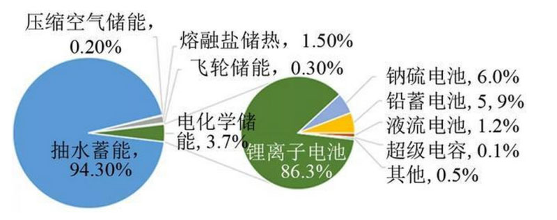 據(jù)中關(guān)村儲能產(chǎn)業(yè)技術(shù)聯(lián)盟(CNESA)統(tǒng)計,截至2018年底,全球已投運儲能項目累計裝機規(guī)模為181.0 GW,同比增長3.2%[2,3]。電化學儲能裝機為6.6254 GW,同比增長126.4%,占比為3.7%,較上一年增長2.0個百分點。各類儲能具體占比如圖1所示。目前,中國已投運儲能項目裝機規(guī)模31.3 GW,占全球市場的17.3%。其中,電化學儲能是除抽水蓄能外裝機規(guī)模最大的儲能形式[4],累計1072.7 MW。同時,電化學儲能也是目前各類儲能應用中,除抽水蓄能之外應用最廣泛、技術(shù)發(fā)展最快、產(chǎn)業(yè)基礎最好的儲能技術(shù)。以鋰離子電池、鉛酸電池、液流電池為主導的電化學儲能不僅在電池本體技術(shù)和系統(tǒng)集成技術(shù)層面取得了重大突破,并且在發(fā)電領(lǐng)域的場景應用范圍也實現(xiàn)了重要擴展。因此本文主要針對電化學儲能相關(guān)政策、技術(shù)及其應用予以闡述。