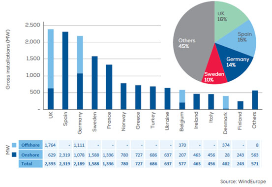 2019年的新增風(fēng)電裝機(jī)中,陸上風(fēng)電占四分之三。西班牙新增陸上風(fēng)電裝機(jī)2.2GW,位列陸上風(fēng)電裝機(jī)第一。德國(guó)風(fēng)電新增裝機(jī)和投資2019年出現(xiàn)斷崖式下滑。