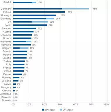 2019年,丹麥風(fēng)力發(fā)電占其電力需求的份額最高,達(dá)到48%,其次是愛爾蘭(33%)和葡萄牙(27%)。