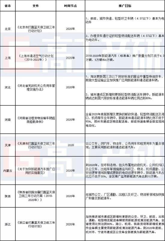 全國(guó)部分省市新能源物流車推廣目標(biāo)
