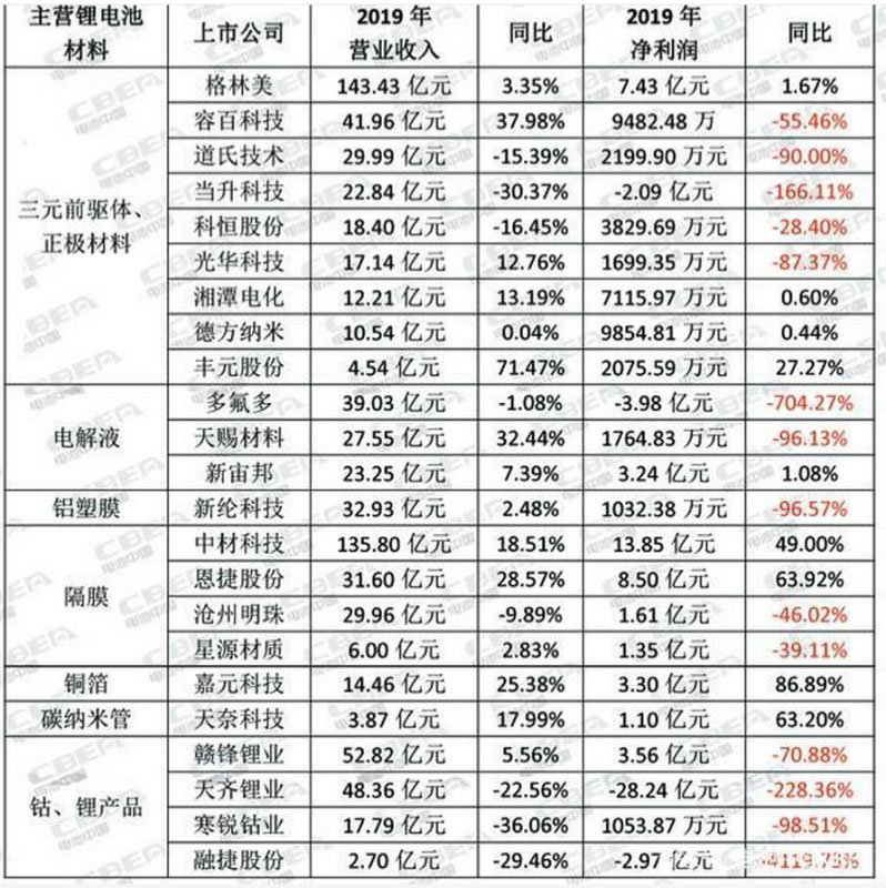 涉鋰電池材料部分上市公司2019年營業(yè)收入及凈利潤統(tǒng)計