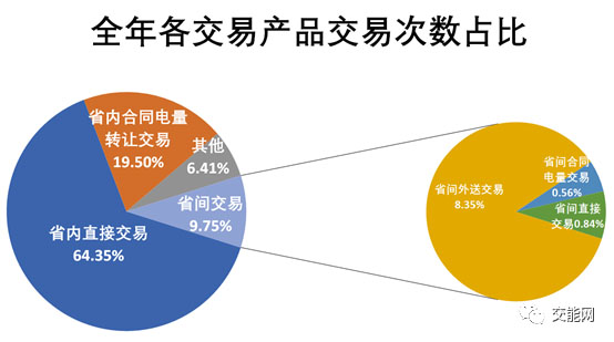 根據(jù)交能網(wǎng)對(duì)全年公開電力交易結(jié)果的分析,2019年省內(nèi)直接交易占據(jù)了所有交易次數(shù)的64.35%,相較于2018年的56%略有提升。省內(nèi)合同電量轉(zhuǎn)讓交易數(shù)量占比則為19.5%,基本維持不變。與此相對(duì)應(yīng)的電量比例如下: