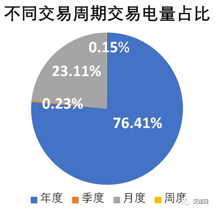 按照電力交易周期區(qū)分,電力交易分為年度、季度、月度及周度交易。2019年全國(guó)電力交易不同交易周期占比結(jié)構(gòu)與去年較為一致。但年度交易成交量為主導(dǎo)的趨勢(shì)更為明顯,高達(dá)76.41%,相比去年高出6.81%,遠(yuǎn)多于其他所有交易成交電量總和,穩(wěn)穩(wěn)占據(jù)市場(chǎng)主要地位。相比之下月度交易則有一個(gè)明顯的下降,由去年的28.67%,下降至23.11%。