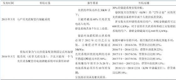 在國際市場中發(fā)揮重要影響的另一個分布式儲能補貼類政策出自于德國。德國的分布式光儲補貼政策歷時6年,共分為兩個階段。第一個階段是2013年—2015年底。在這個階段,光儲補貼政策主要為戶用儲能設備提供投資額30%的補貼,并通過德國復興信貸銀行KfW對購買光伏儲能設備的單位或個人提供低息貸款,對于新安裝的光伏儲能系統(tǒng)給予最高600歐元/kWp的補貼,而對于進行儲能改造的光伏系統(tǒng)最多可給予660歐元/kWp補貼。該政策還要求補貼對象滿足兩個必要條件:一是光伏運營商最高只能將其60%的發(fā)電量送入電網(wǎng);二是只支持具備7年以上質(zhì)保的儲能系統(tǒng)[2]。第二個階段是2016—2018年底。新的補貼政策延續(xù)了上一期的機制,補貼的形式主要是低息貸款和現(xiàn)金補助,補貼總額約3000萬歐元。與第一階段政策不同的是,第二階段只允許用戶最高將光伏系統(tǒng)峰值功率的50%回饋給電網(wǎng),以鼓勵用戶最大限度的自發(fā)自用,電網(wǎng)運營商承擔核查功率限值的職責。另外,對于不同時間提出的申請,可申請的補貼率(補助資金相對于儲能設備價格的比例)逐漸遞減[3]。補貼項目的資金通過德國KfW銀行發(fā)放,資金來源于德國聯(lián)邦經(jīng)濟事務和能源部(BMWI)撥款。