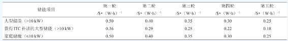 按照規(guī)定,儲能補貼的總資金分為五輪發(fā)放,第一輪補貼的標準為50美分/(W·h),第二輪補貼標準降低10美分/(W·h),之后的補貼標準逐步降低5美分/(W·h)。儲能系統(tǒng)可獲得的補貼等于系統(tǒng)容量(W·h)與所在輪數(shù)的補貼標準的乘積。例如某套儲能系統(tǒng)沒趕上第一輪申請,但成功的進入了第二輪申請,那么其補貼標準按照40美分/(W·h)執(zhí)行。補貼除了跟資金處于發(fā)放的輪數(shù)有關(guān),還隨著系統(tǒng)時長的增加而階梯式降低,也隨著系統(tǒng)容量的增加而階梯式降低。如表2、表3所示。