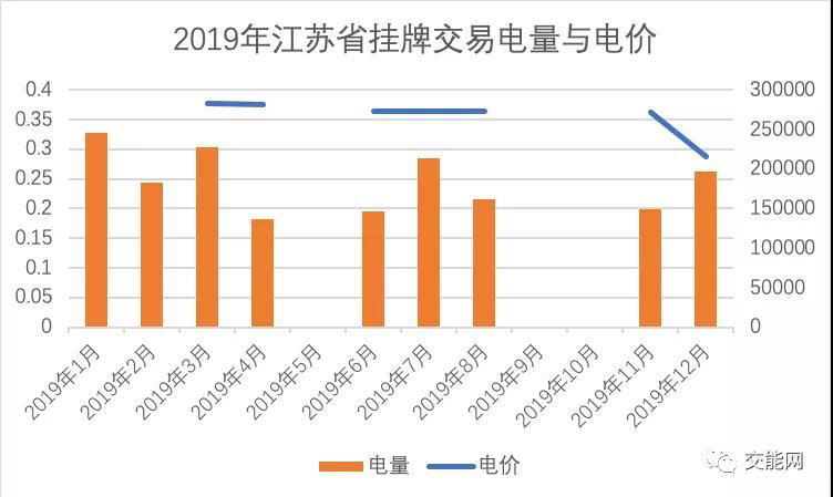 江蘇省的兩種主要交易方式中,集中交易電量占比較高,交易電量大于通過掛牌方式交易的電量,且全年的電價(jià)除了年初和年末兩個(gè)月份偏低外,在2到11月相當(dāng)穩(wěn)定。掛牌交易的電價(jià)也在年末有了一定程度的下降。