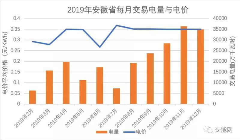 安徽省2019年月度集中交易次數(shù)很多但單次交易電量并不高,年度雙邊協(xié)商交易次數(shù)雖少但交易電量數(shù)額偏大。每月交易電量在2到8月有所浮動(dòng),但在8月以后逐步上升。其電價(jià)在2、3和6月較低,其他時(shí)間則比較穩(wěn)定。