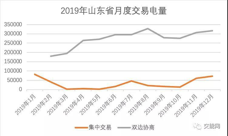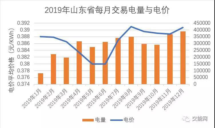 山東省在2019年,仍有條不紊的進(jìn)行著月度集中交易及月度雙邊交易。從圖中可以看出,山東省 在4到6月電價(jià)有所下降,8到12月則偏高。另外,2019年山東交易電量整體呈上升趨勢(shì),并在11和12月份達(dá)到峰值。