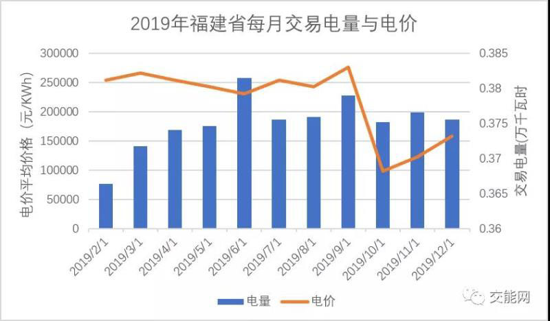 從圖中可以看出,2019年福建省月度交易電量穩(wěn)中有升,6月和9月的交易電量略高于其他月份數(shù)據(jù)。電價(jià)在2月到9月份比較平穩(wěn),9月之后有明顯的下降趨勢(shì),但平均電價(jià)仍處于國內(nèi)的第一梯隊(duì)。