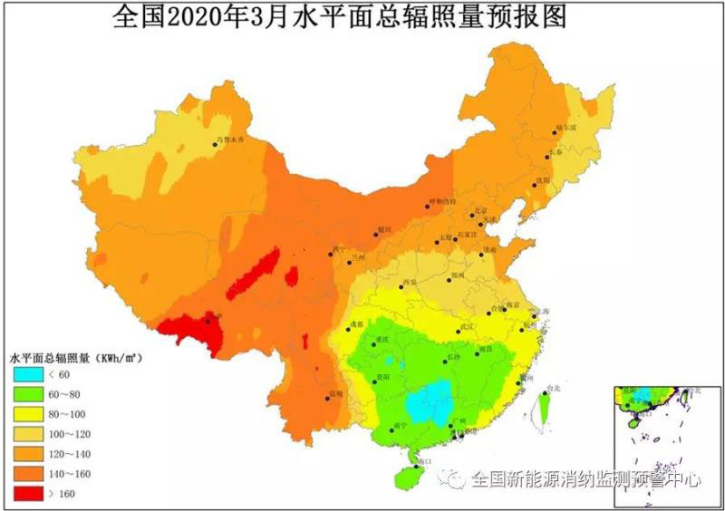 附圖6 全國(guó)2020年3月水平面總輻照量預(yù)報(bào)圖