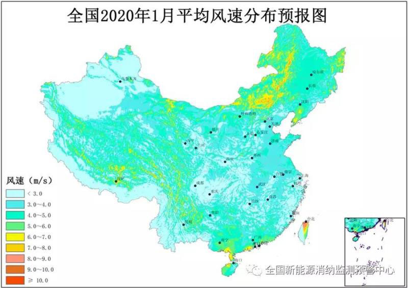 附圖1 全國(guó)2020年1月平均風(fēng)速分布預(yù)報(bào)圖