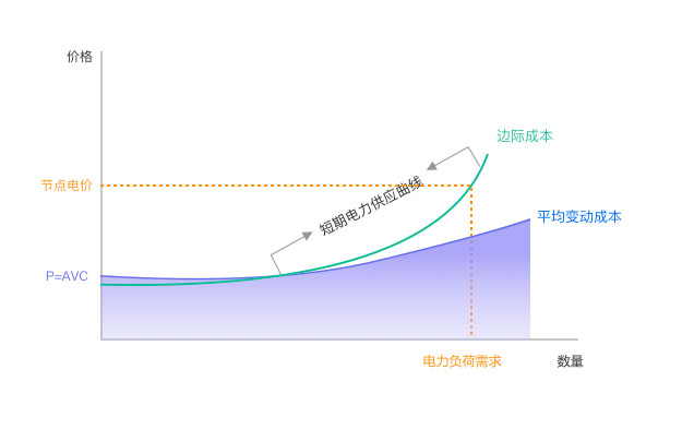 在解決了機(jī)組如何通過報價決定是否開機(jī)后,我們繼續(xù)分析機(jī)組的整體報價應(yīng)該處于什么水平才有利于實(shí)現(xiàn)利潤最大化。由于市場處于完全競爭的水平,所有以實(shí)現(xiàn)利潤最大化為目的的理性發(fā)電企業(yè),在P>AVC時會開機(jī);所有開機(jī)機(jī)組只要節(jié)點(diǎn)電價在其邊際成本之上(邊際效益大于零),就有動機(jī)提升出力水平以增加利潤,直至邊際成本等于節(jié)點(diǎn)電價(邊際效益為零)或達(dá)到最大發(fā)電能力。換言之,邊際成本(MC)在平均變動曲線(AVC)之上的部分就是短期電力供應(yīng)曲線(如下圖所示)。當(dāng)電力負(fù)荷需求確定時,節(jié)點(diǎn)電價會基本等于邊際機(jī)組的邊際成本。