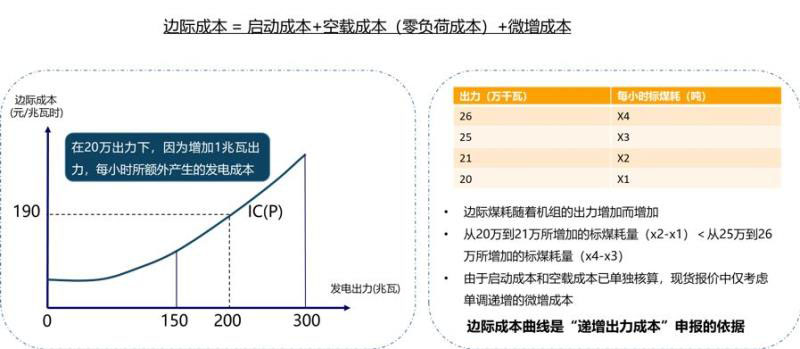 若想使發(fā)電利潤最大化,我們首先需要搞清邊際成本與邊際收益之間的關(guān)系。邊際成本指的是每一單位新增生產(chǎn)的產(chǎn)品帶來的總成本的增量,它通常是一條先下降再上升的U型曲線,這是因?yàn)檫呺H產(chǎn)量(增加一單位生產(chǎn)要素所增加的產(chǎn)量)是先上升后下降的。以煤電機(jī)組為例,隨著我們投煤量的上升,鍋爐溫度和效率也隨之提升,此時度電煤耗在持續(xù)下降——即每多投入一克煤可以(比之前)產(chǎn)生更多的電能量;但這種邊際產(chǎn)量上升的趨勢并不會一直持續(xù)下去,當(dāng)鍋爐效率到達(dá)極限后,邊際產(chǎn)量將開始下降。在這里需要注意的是,由于我國的電力現(xiàn)貨市場采用了美國PJM市場的三部制報價,即報價被分為三個部分:①啟動成本②空載成本③微增成本。啟動成本是指火電機(jī)組的開機(jī)成本;空載成本是指使火電機(jī)組的汽輪機(jī)維持在一定轉(zhuǎn)速所需的成本;微增成本是指火電機(jī)組隨著出力上升而上升的成本。由于交易中心會按政府事先核定的固定價格補(bǔ)償啟動成本和空載成本,所以發(fā)電企業(yè)在日前市場報價時僅需要考慮邊際成本中的微增成本,這是一條單調(diào)上升的曲線。